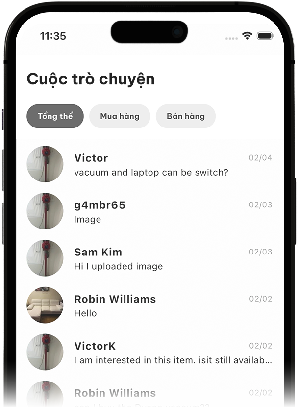 Trò chuyện ngay lập tức với người mua và người bán. Thảo luận, đặt câu hỏi và sắp xếp cuộc hẹn — tất cả trong một nơi.